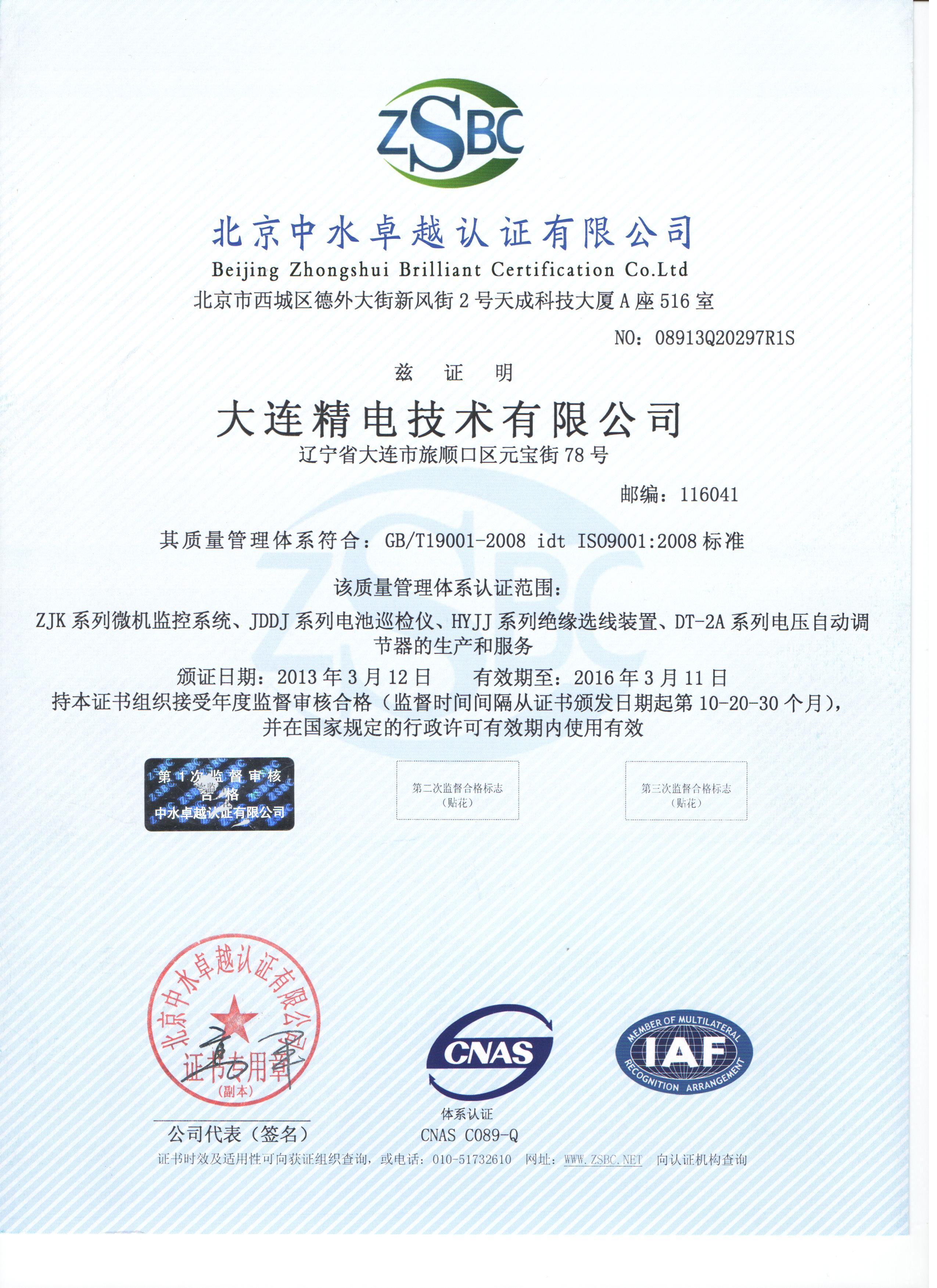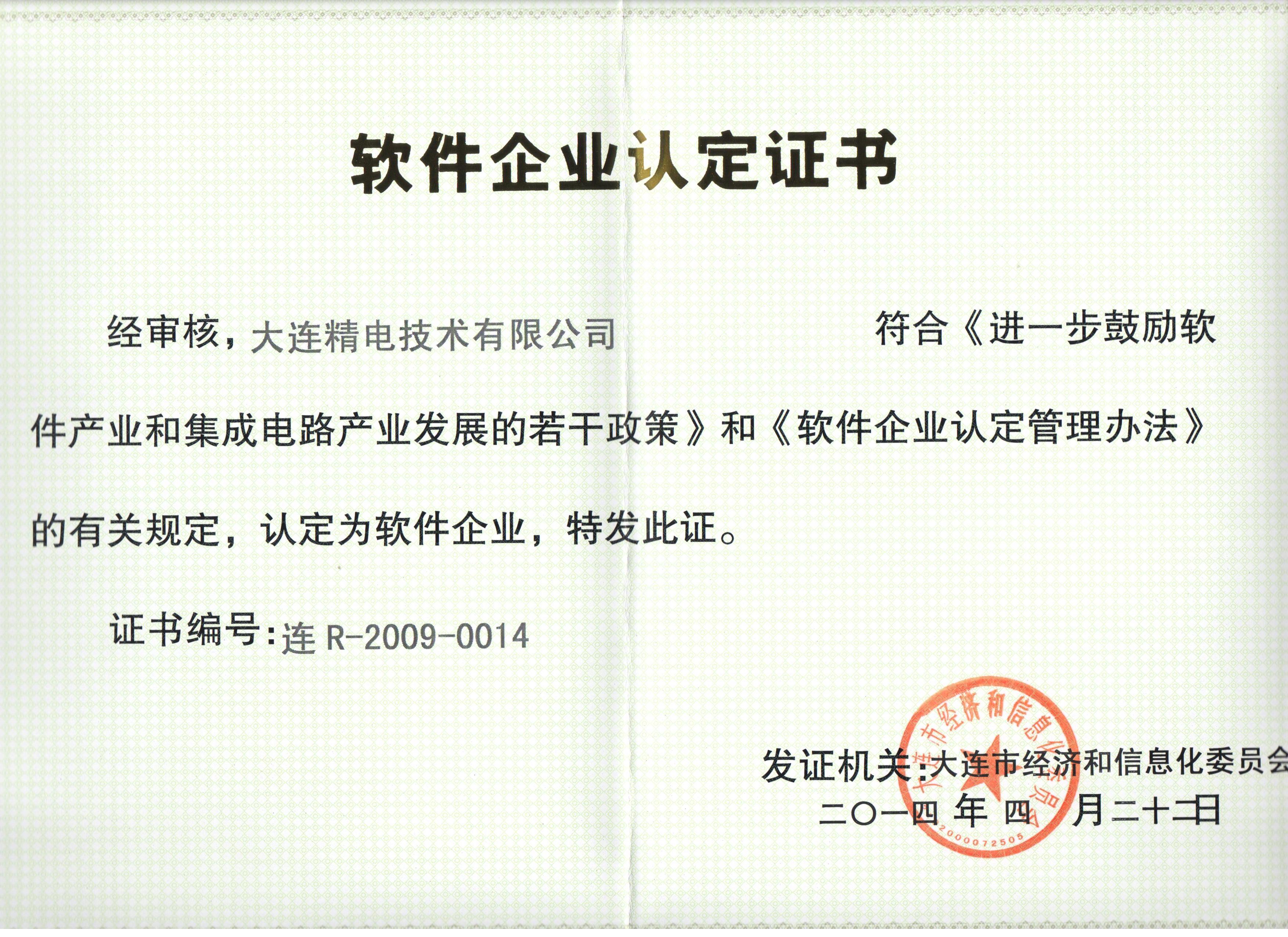 公司已通过ISO9001质量管理体系的认证,主要产品的软件已登记在册,2009年通过大连市软件企业的认证。